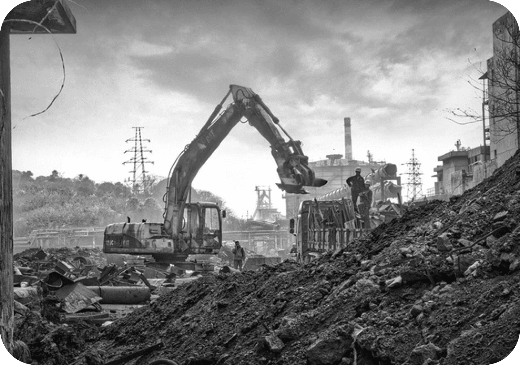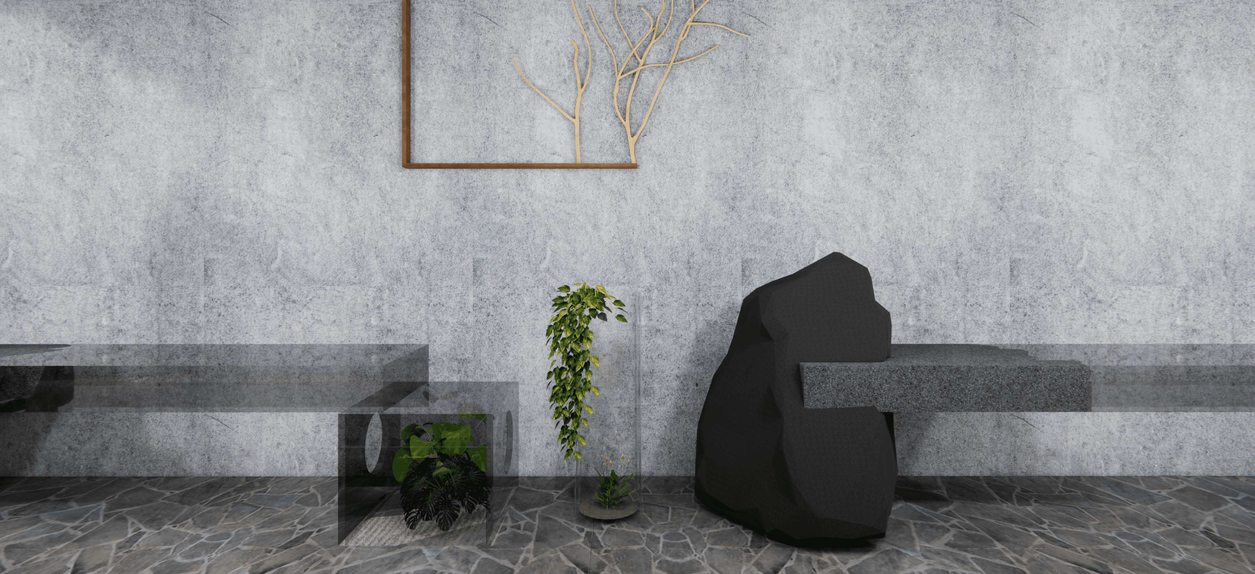 The furniture, crafted from concrete, glass, and reclaimed materials, symbolizes human destruction with urban forms trapped in natural elements.