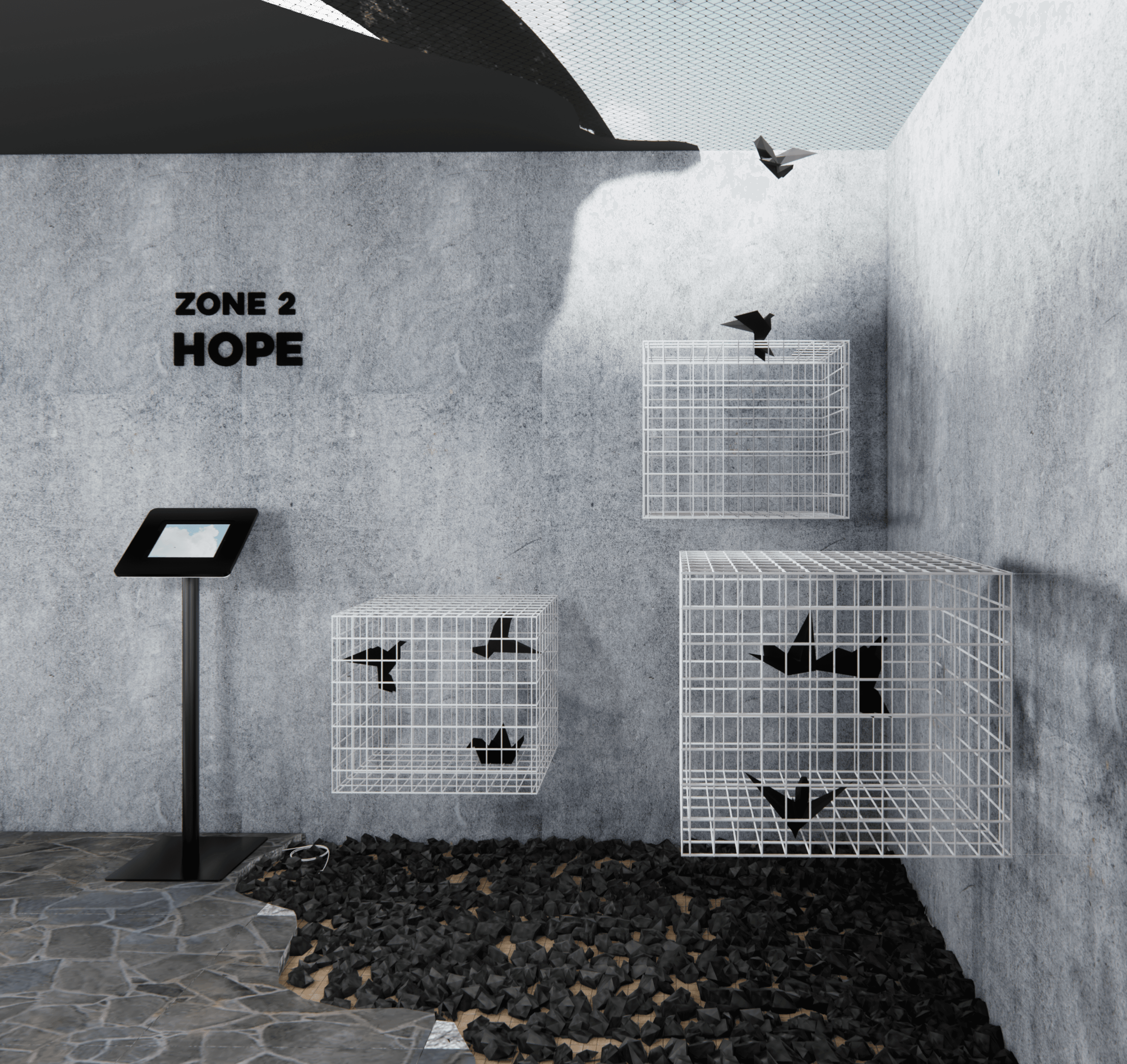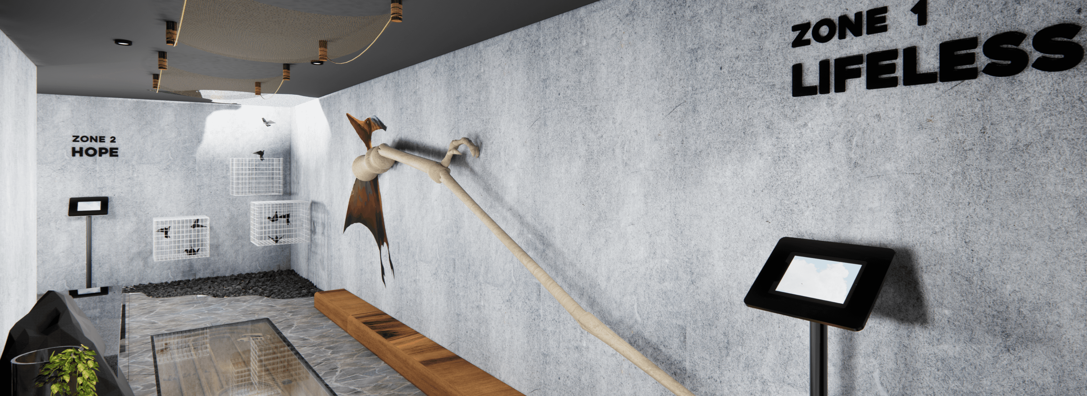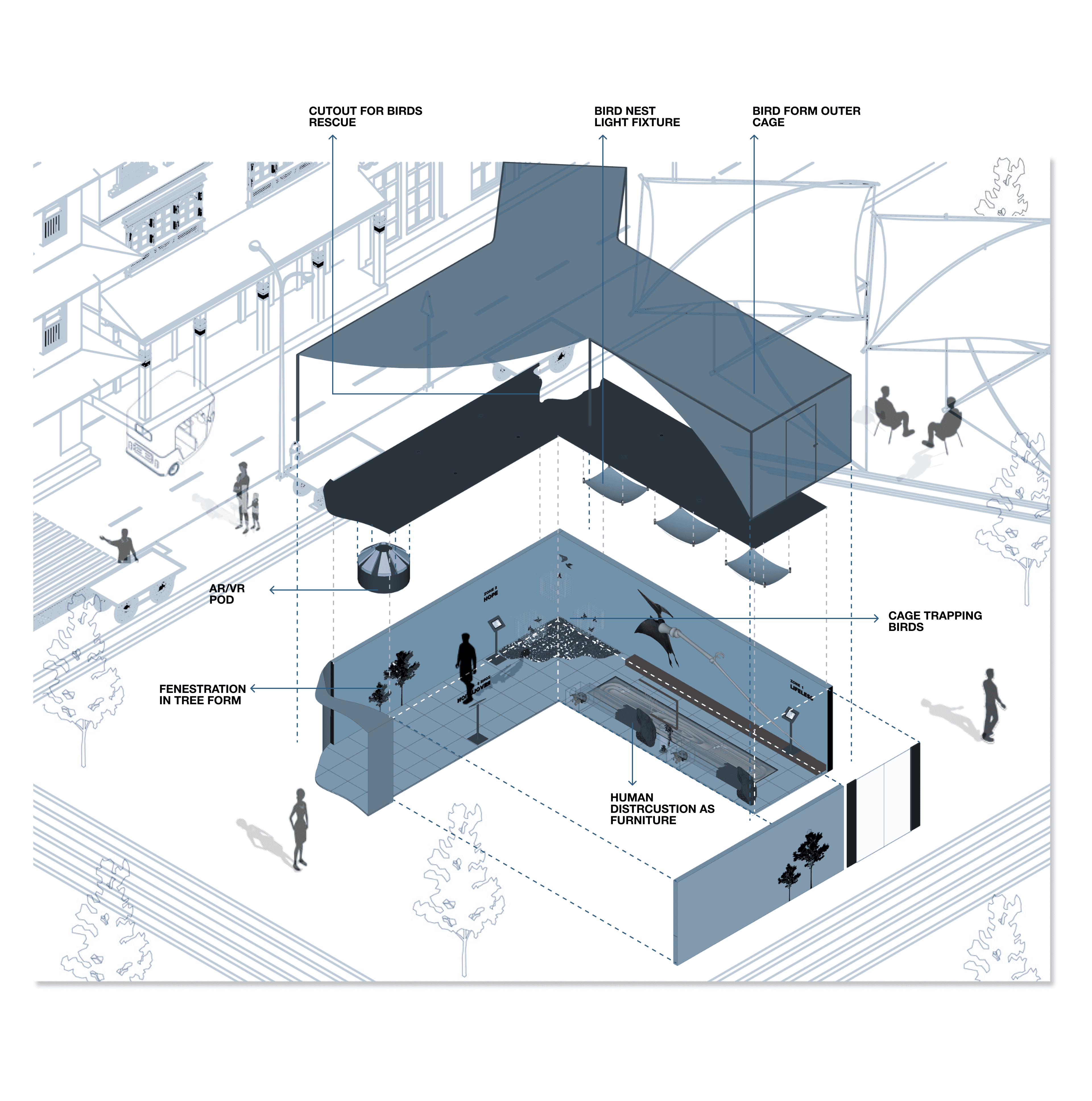 Our studio project reimagines shipping containers as an interactive exhibition, highlighting the plight of captive birds. Centered on freedom and captivity, it immerses visitors in the challenges birds face, from cages to urban landscapes, showcasing their resilience and need for protection. Through engaging installations and educational narratives, the exhibition inspires reflection and action to create a world where all beings can soar freely.