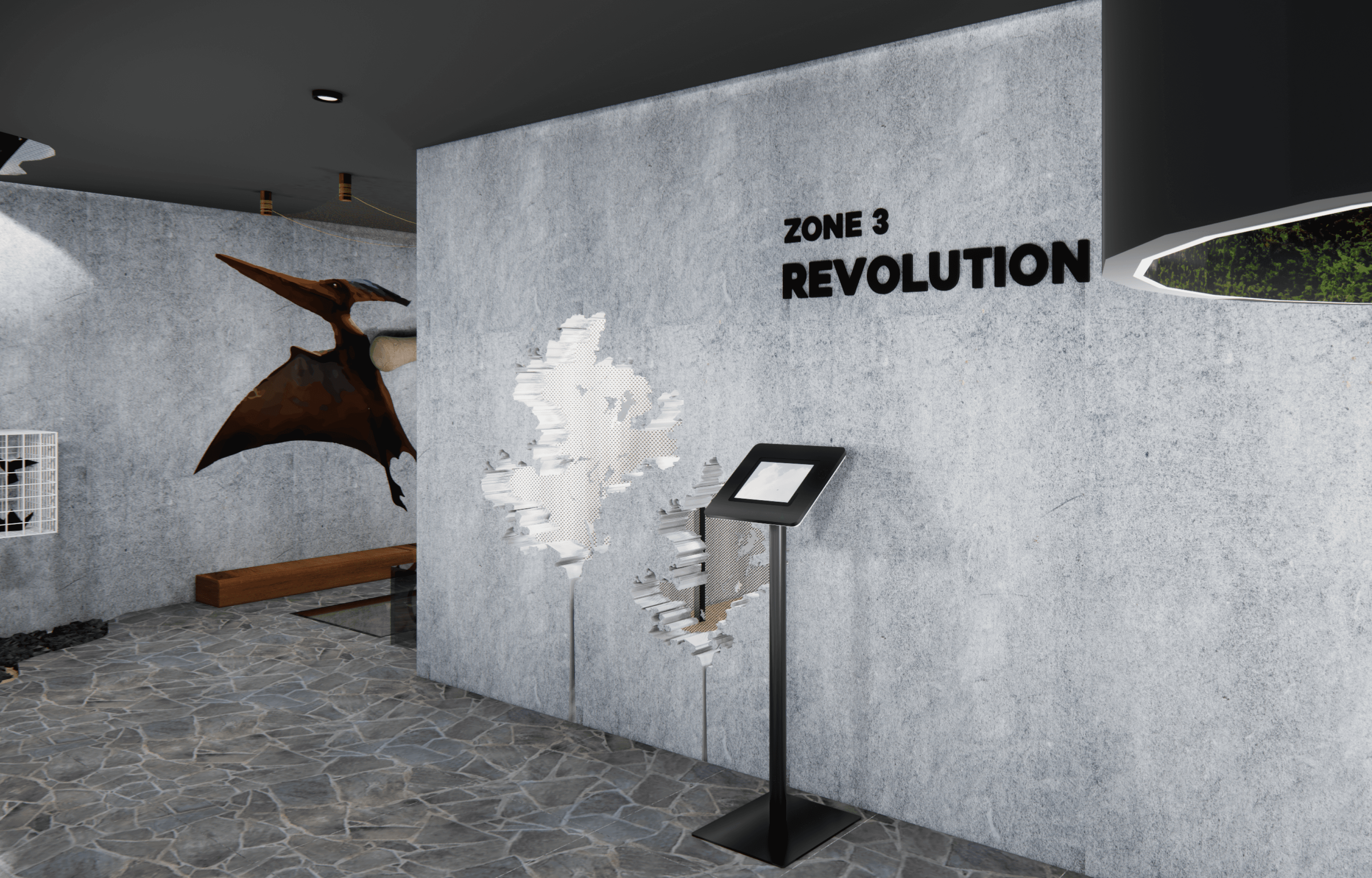 Birds as light fixtures and tree-shaped fenestration allow natural light to create an evocative, reflective environment, highlighting resilience and the need for protection.