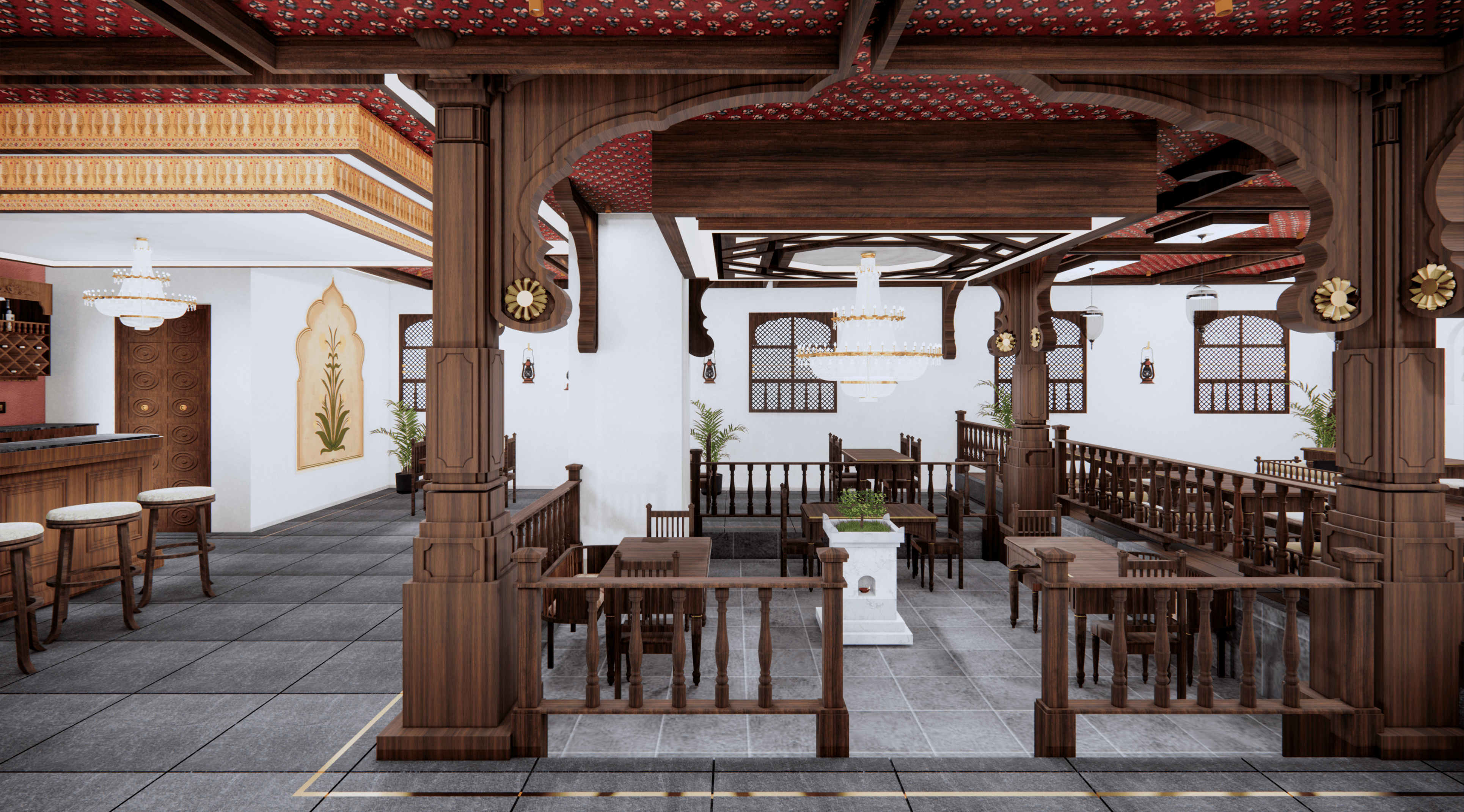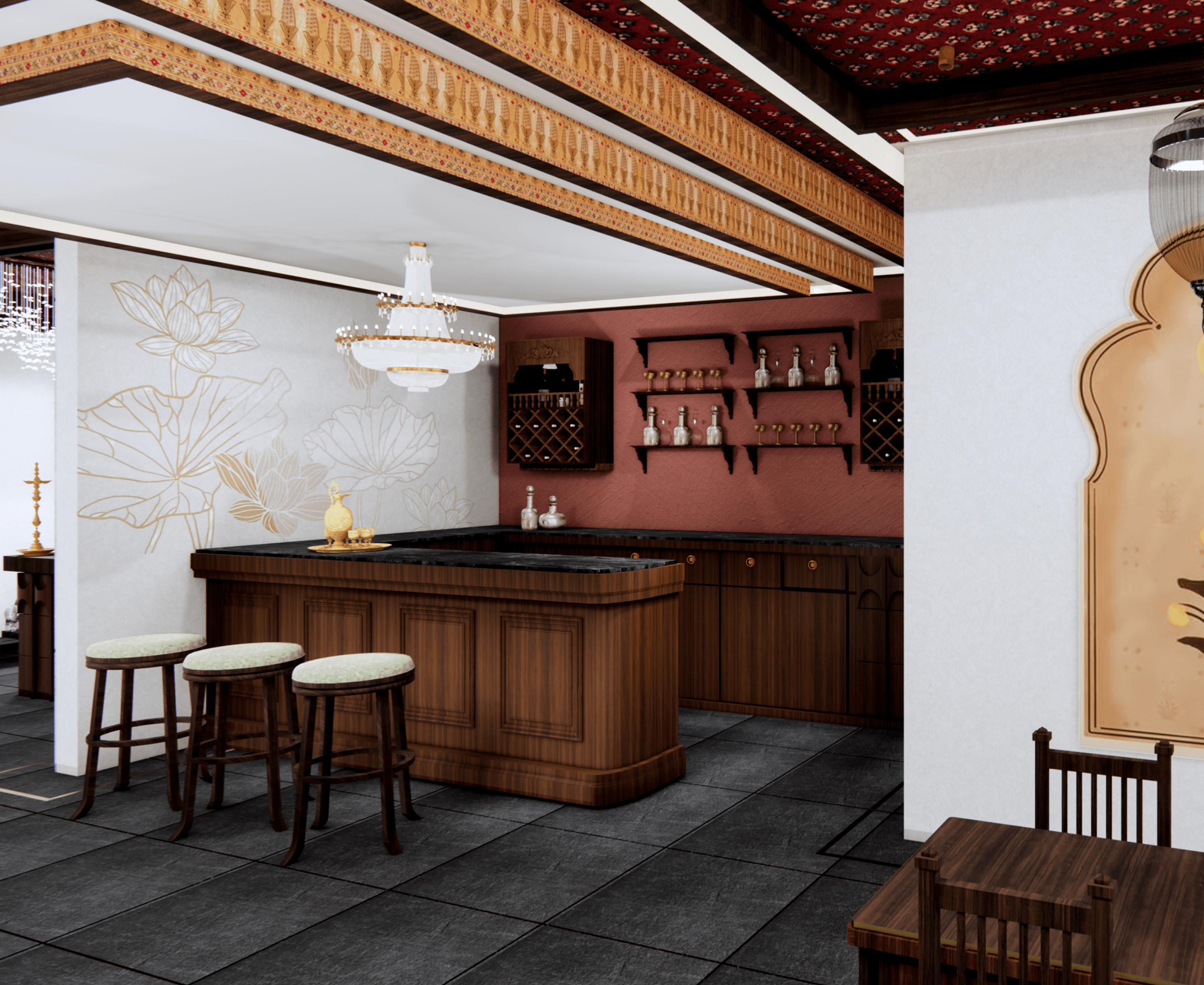 Step into Purna Bhramha, where the essence of Maharashtra comes alive through architecture, art, and aroma. Inspired by the timeless charm of traditional wadas, the design blends Prangan courtyards, Bethak floor seating, and intricate wood carvings with earthy hues and cultural storytelling. Soft, lantern-lit glows set the mood, while murals and artifacts whisper tales of heritage. Every detail, from the ambiance to the traditional serving ware, transports guests to a bygone era—offering not just a meal, but an experience steeped in history, warmth, and authenticity.