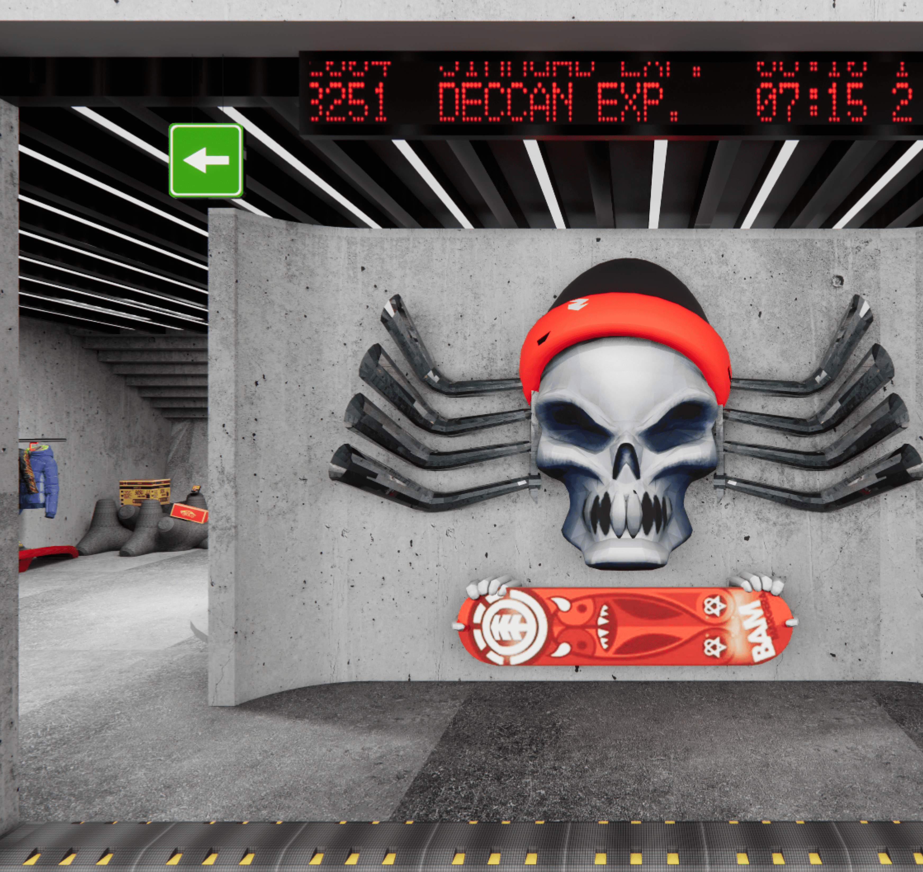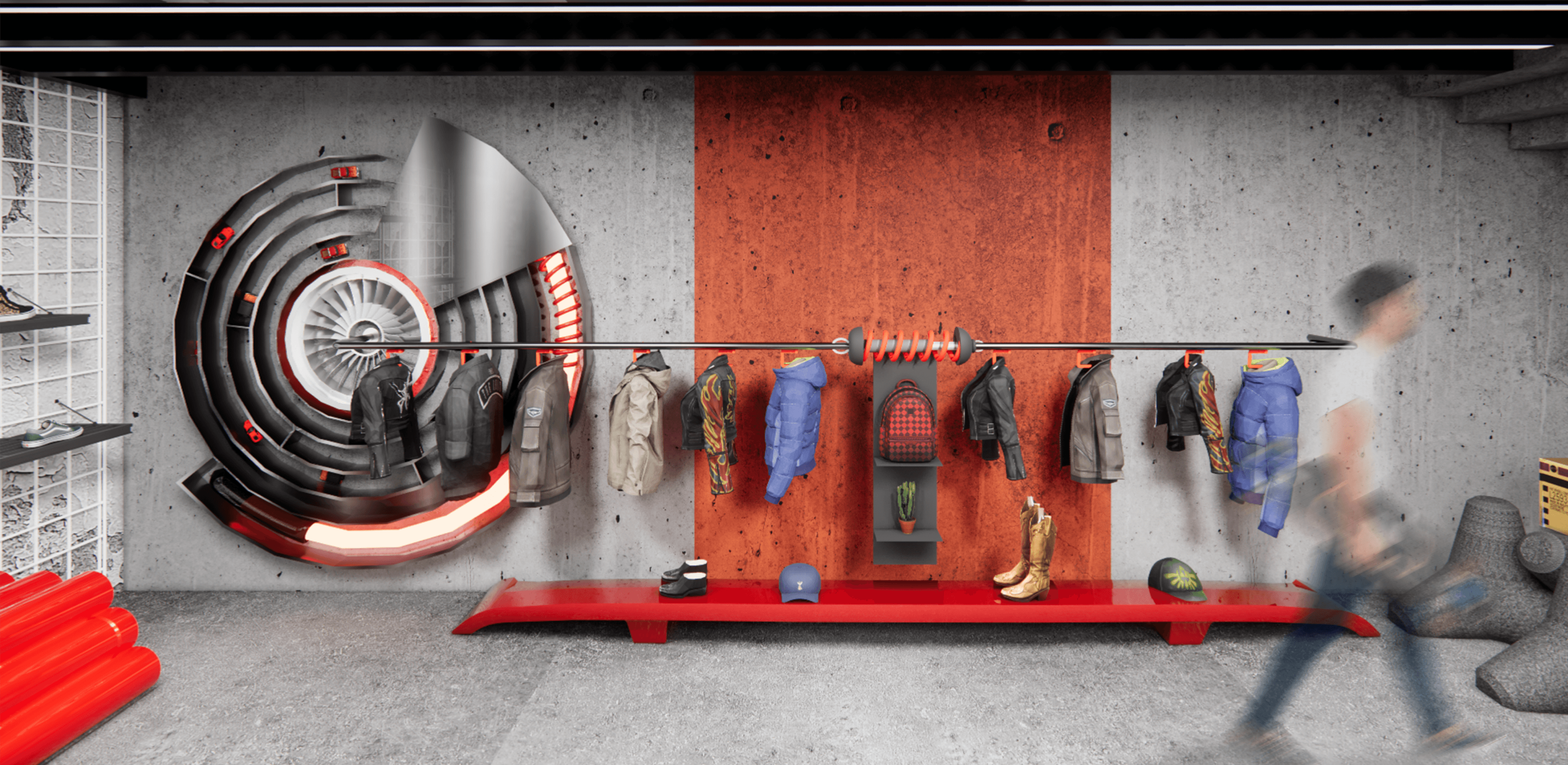 The Hot Spot Mascot is the bold centerpiece of the Hot Wheels and Vans experience store, combining industrial aesthetics, urban street culture, and immersive visuals for an eye-catching storefront.
