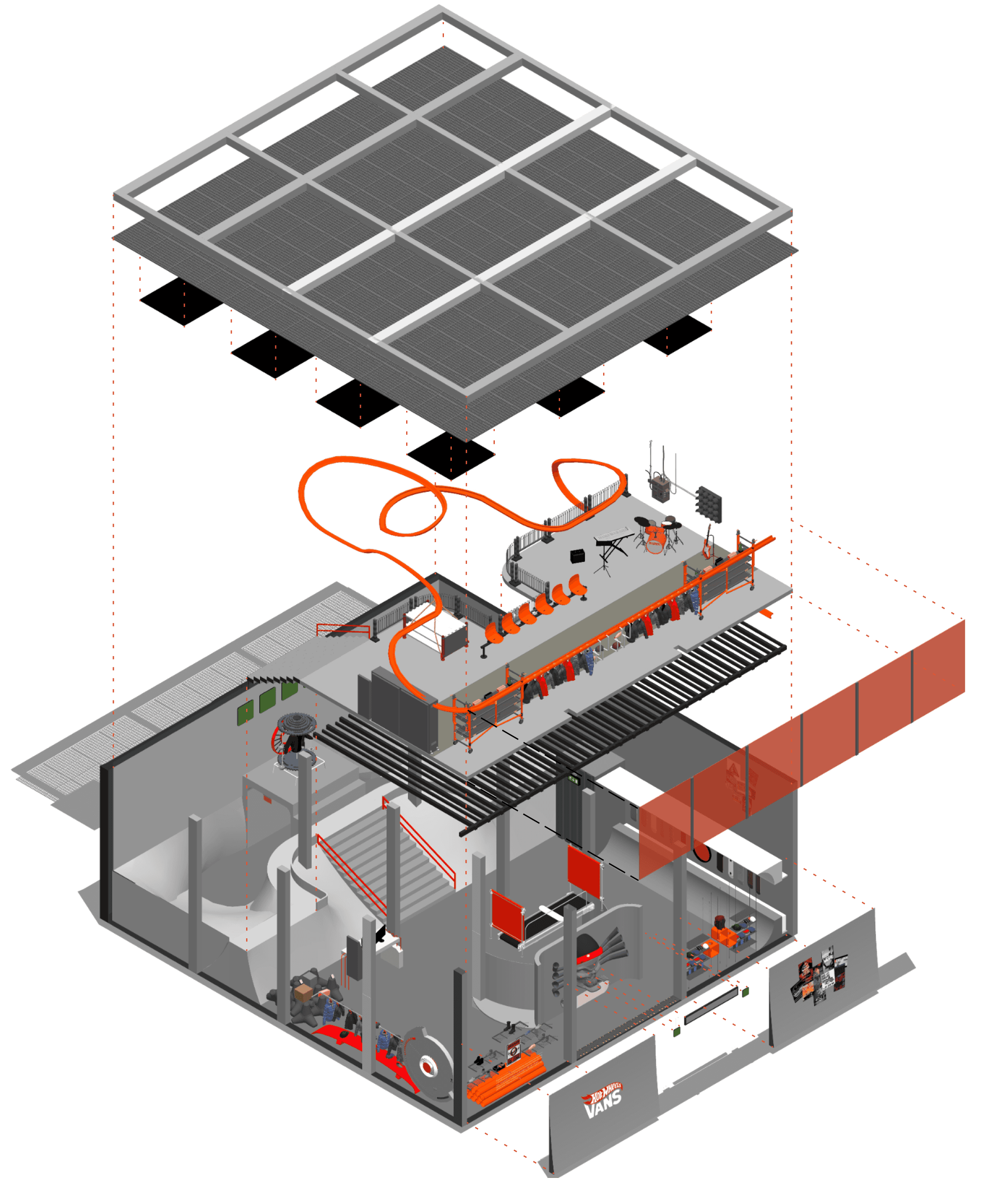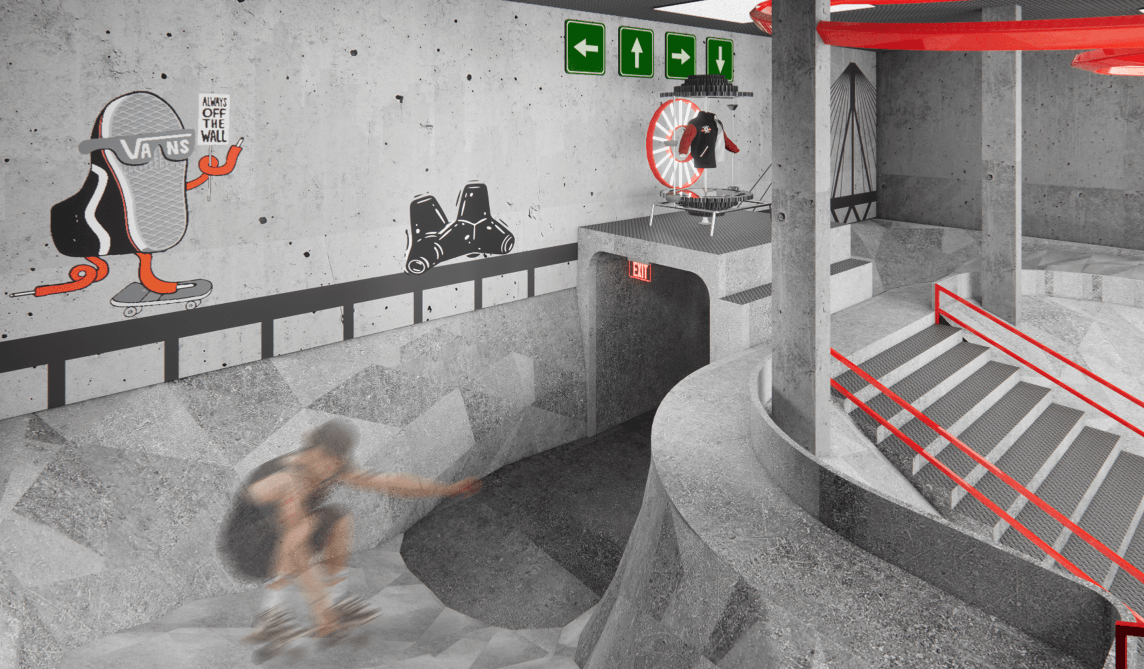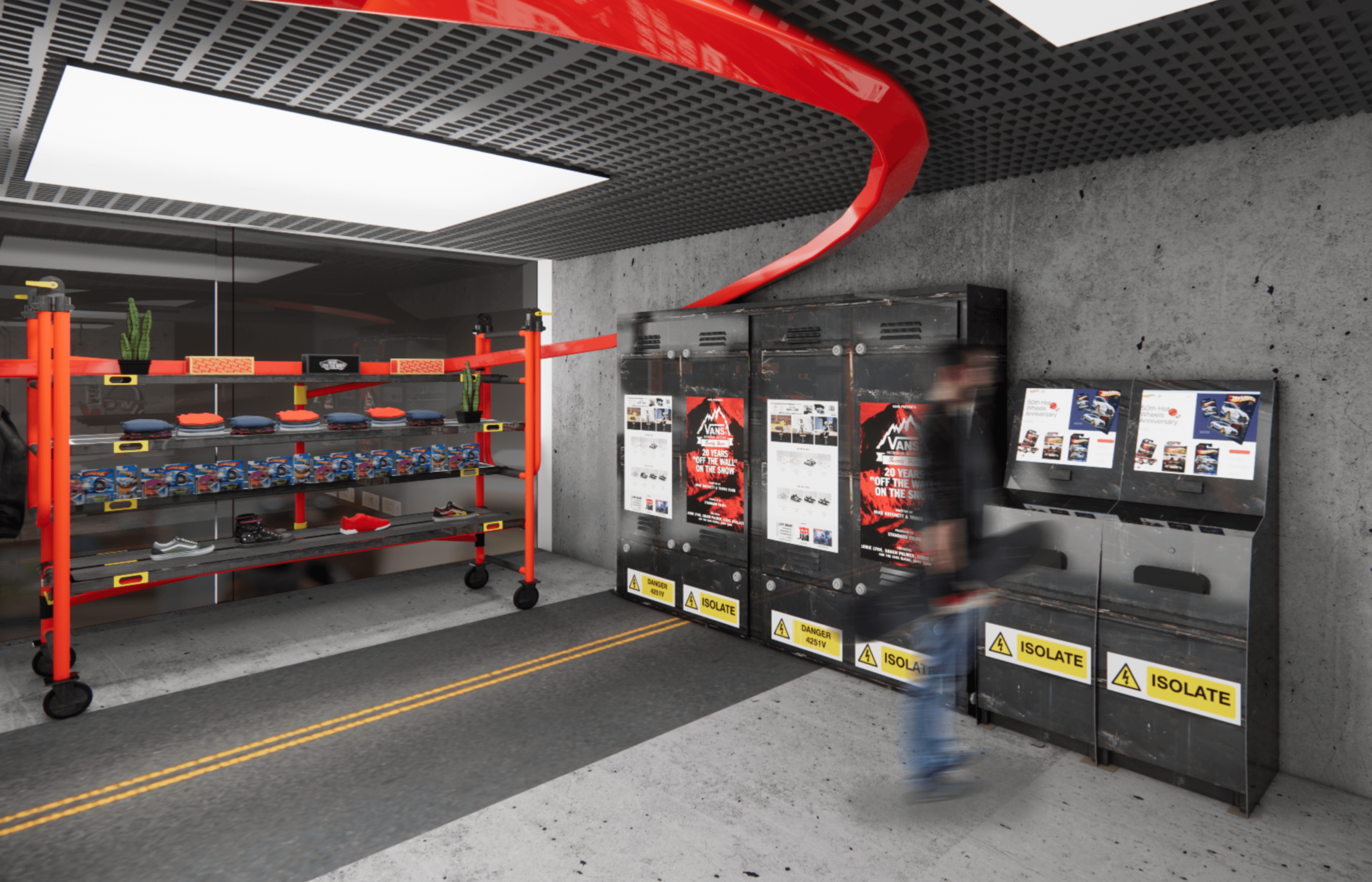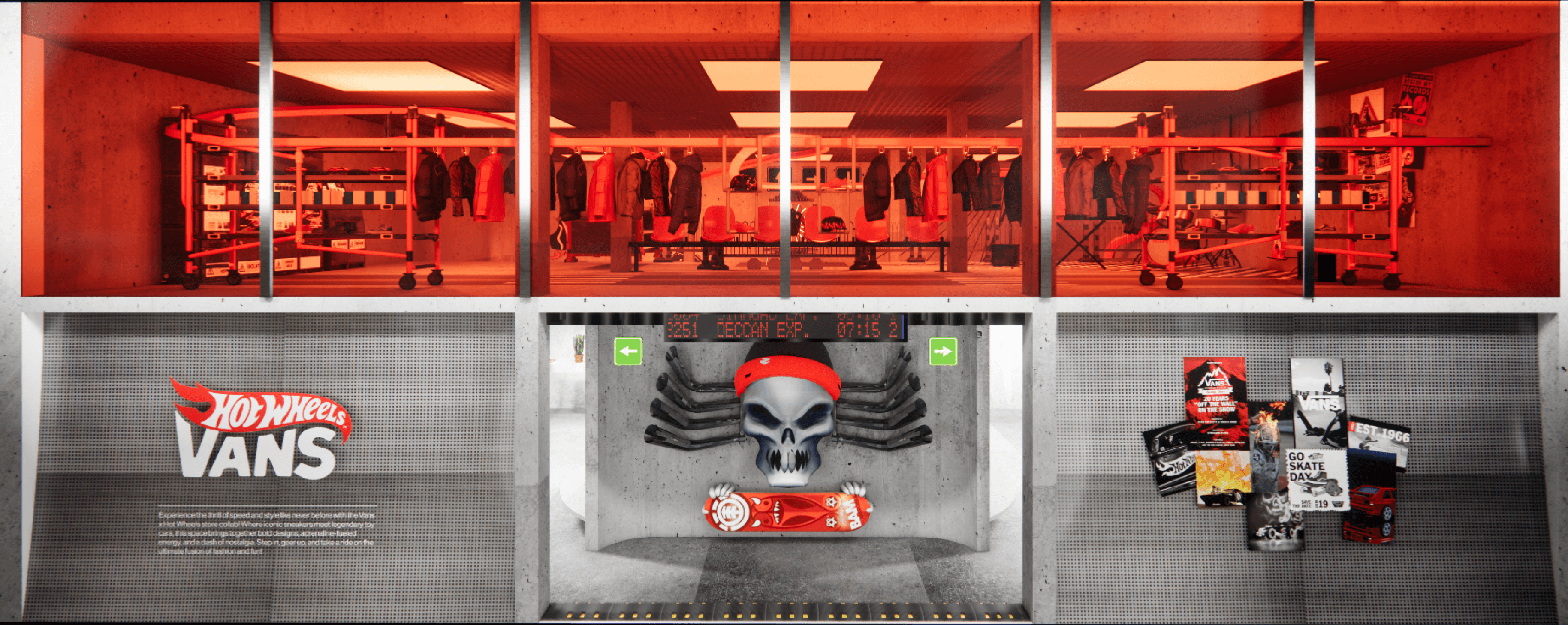Design a dynamic retail space in Mumbai that blends Vans’ streetwear ethos with Hot Wheels’ high-speed energy, offering an immersive phygital experience.
